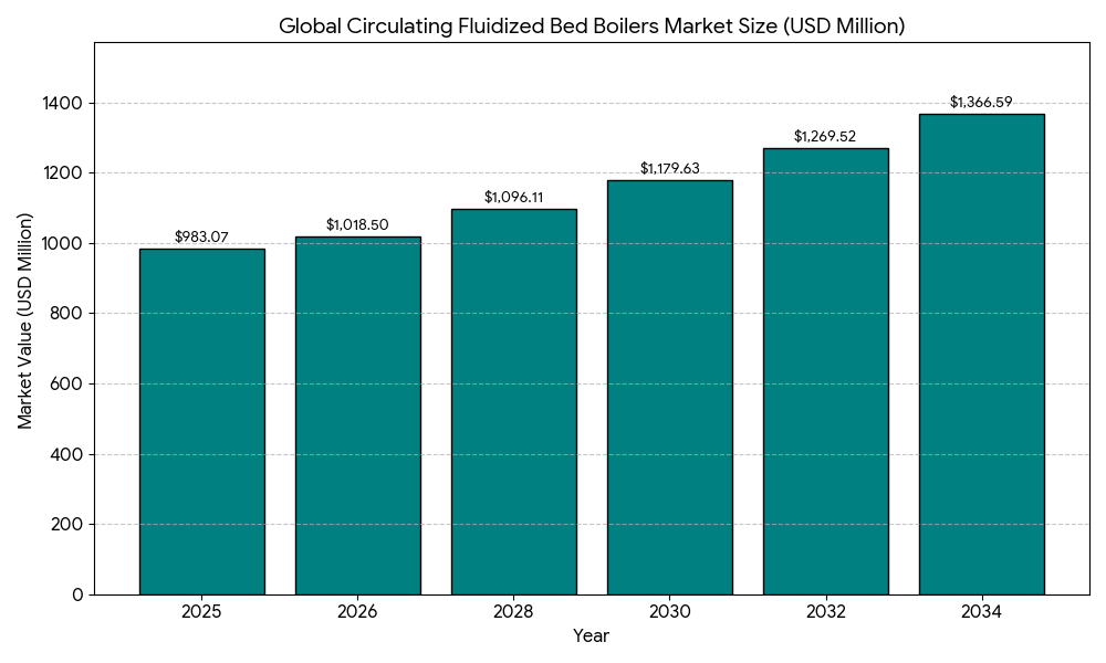 포춘 비즈니스 인사이트에 따르면, 전 세계 순환 유동층 보일러 시장은 2025년에 9억 8,307만 달러 규모에 도달했으며, 2026년에는 10억 1,850만 달러, 2034년에는 13억 6,659만 달러로 성장할 것으로 예상됩니다. 이는 예측 기간 동안 연평균 3.74%의 복합 성장률을 나타내며, 연료 유연성과 환경 규제 준수를 위한 에너지 솔루션에 대한 산업 수요에 힘입은 꾸준한 성장을 반영합니다.